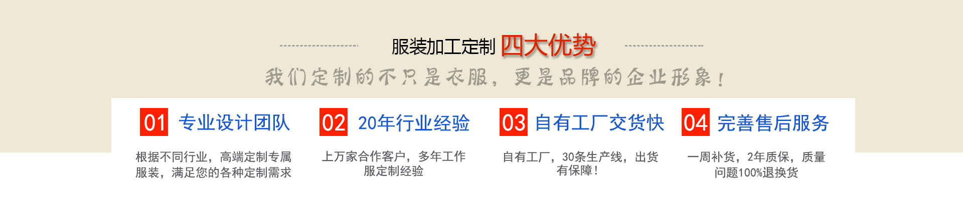 服裝加工網(wǎng)是一家及設(shè)計(jì)、生產(chǎn)、銷售為一體的專業(yè)服裝生產(chǎn)型企業(yè), 根據(jù)客戶需求定制西服襯衫工作服大衣棉服等產(chǎn)品,近二十年工作服職業(yè)裝定做經(jīng)驗(yàn)積累, 工期短交貨及時,免費(fèi)提供團(tuán)體定制上門量體服務(wù),送貨上門,免費(fèi)修改,完善的售后服務(wù), 滿足您的各種定制需求!